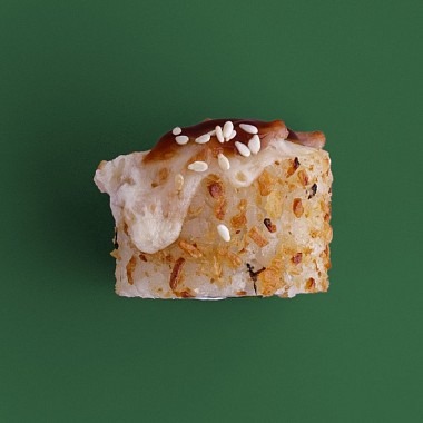 Сытный и смелый, как настоящий ковбой из техаса - запеченный ролл с беконом, сыром моцарелла и сливочным, хрустящим огурчиком, криспи луком и унаги соусом.