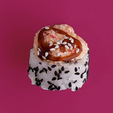Запеченный ролл с фирменным спайси соусом, снежным крабом, кальмаром, сливочным сыром и соусом унаги.