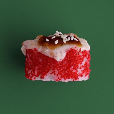 Состав: снежный краб, икра масаго красная, огурец, темпура, унаги соус, кунжут.