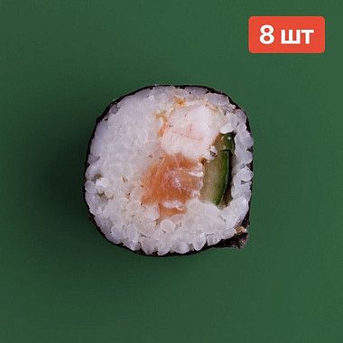 Состав: лосось, креветка тигровая, спайси соус, огурец.