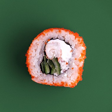 Состав: креветка тигровая, сливочный сыр, снежный краб, огурец, икра масаго оранжевая.