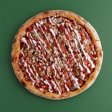 Любимое сочетание куриного филе, овощного микса: томатов, свежего огурчика, китайской капусты и лука, а также сыр моцарелла, пицца-соус и сливочно-чесночный соус