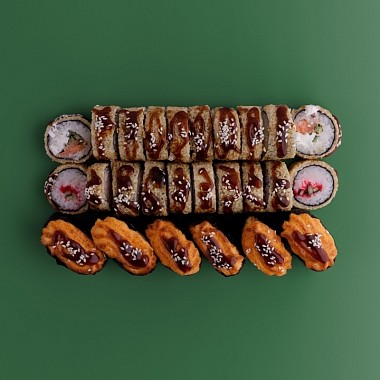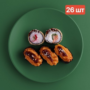 Филадельфия в темпуре, Калифорния в темпуре, Запеченые острые суши крабом (2 шт.), Запеченые острые суши с креветкой (2 шт.), Запеченые острые суши с курицей (2 шт.) (идеально на 2-3 персоны)